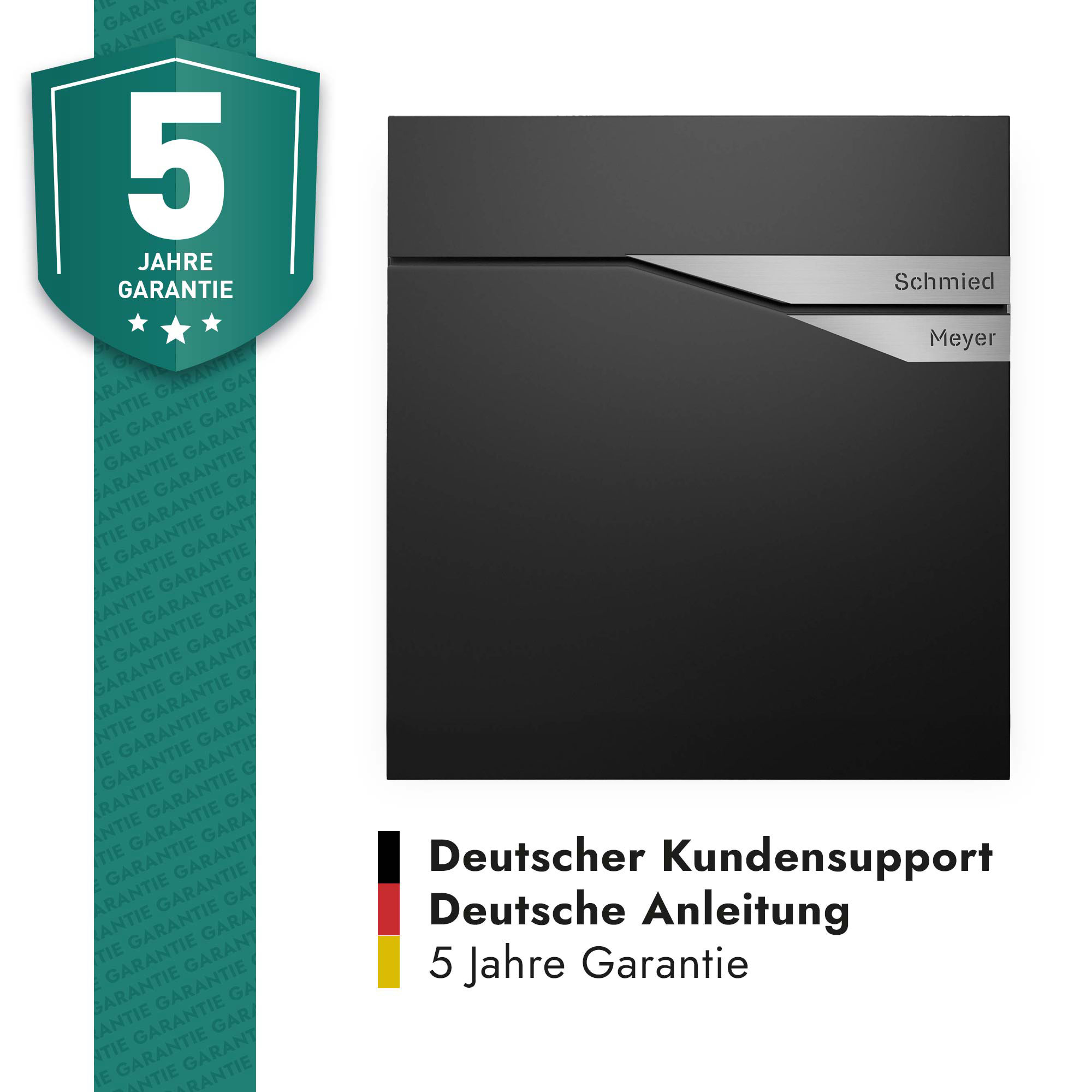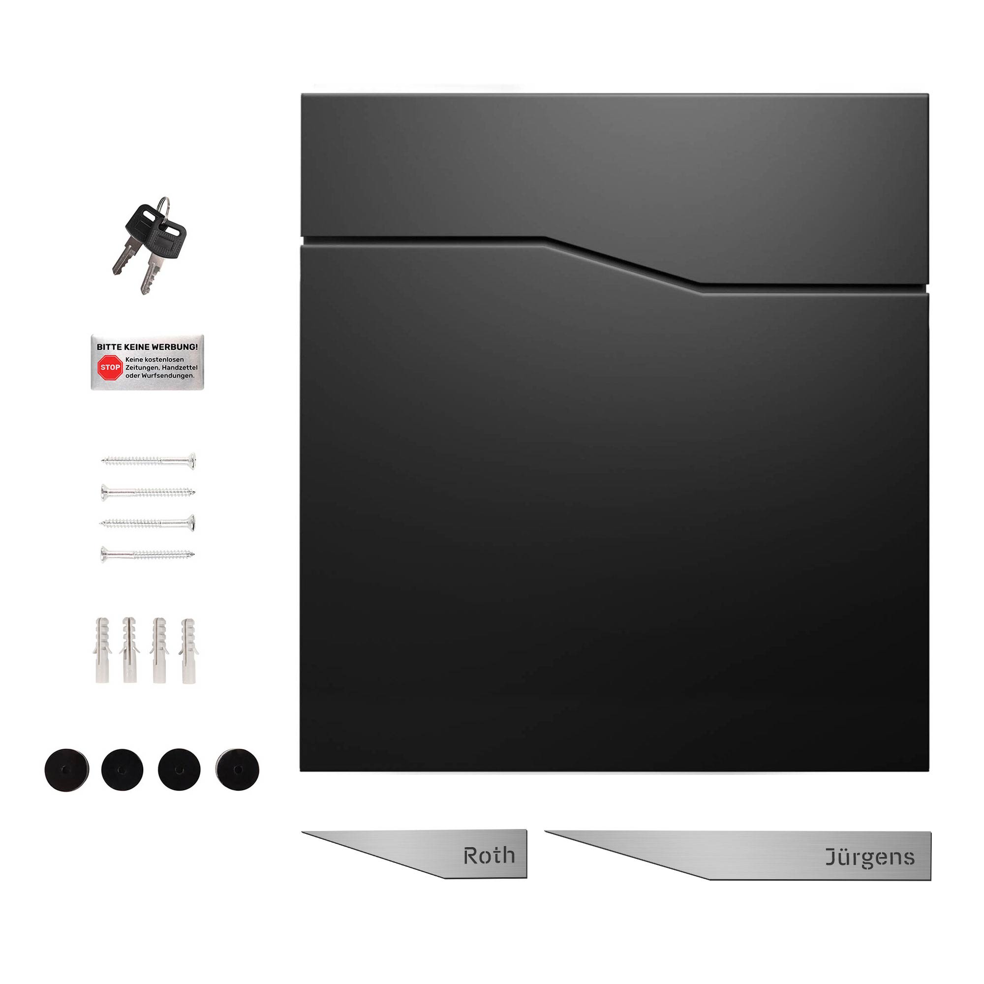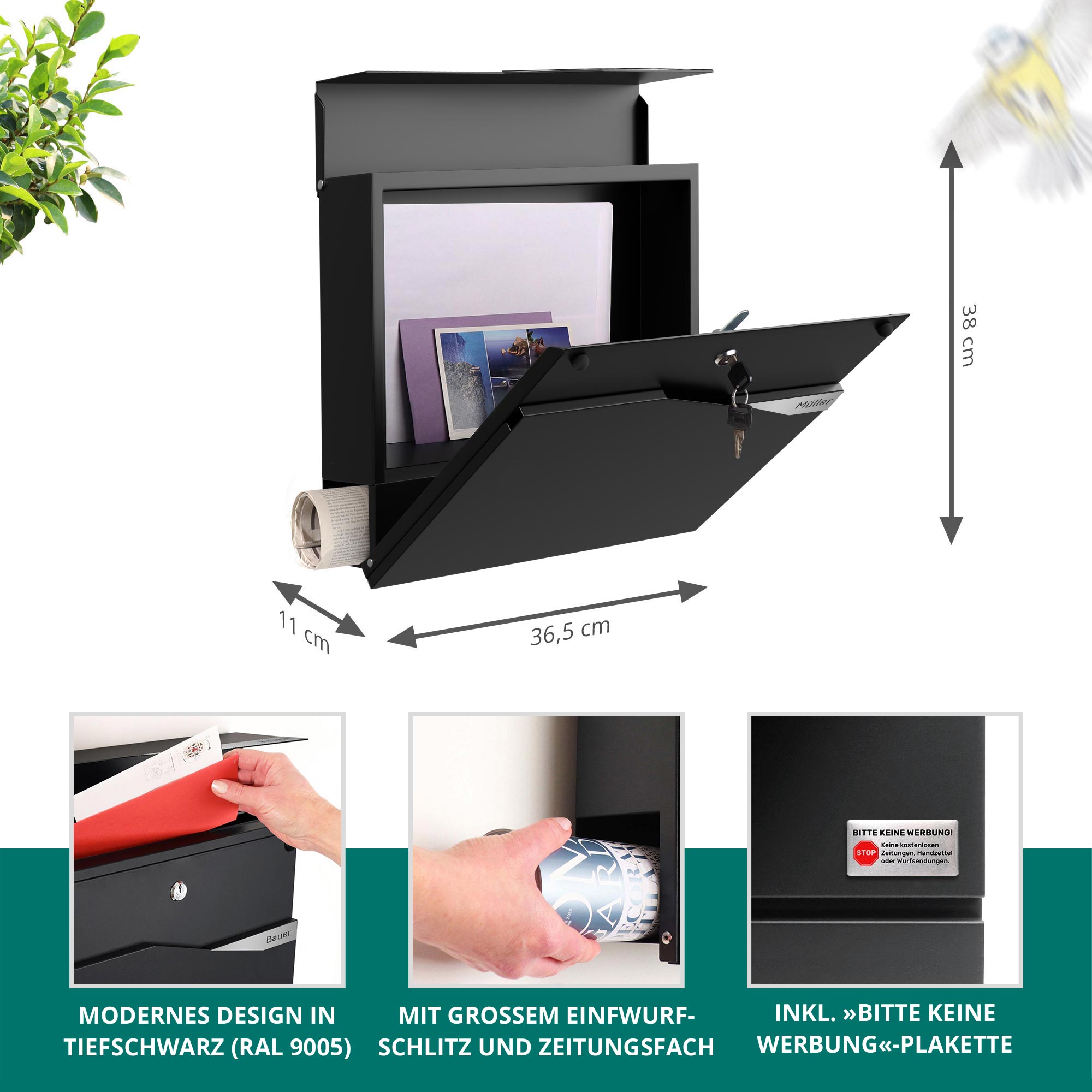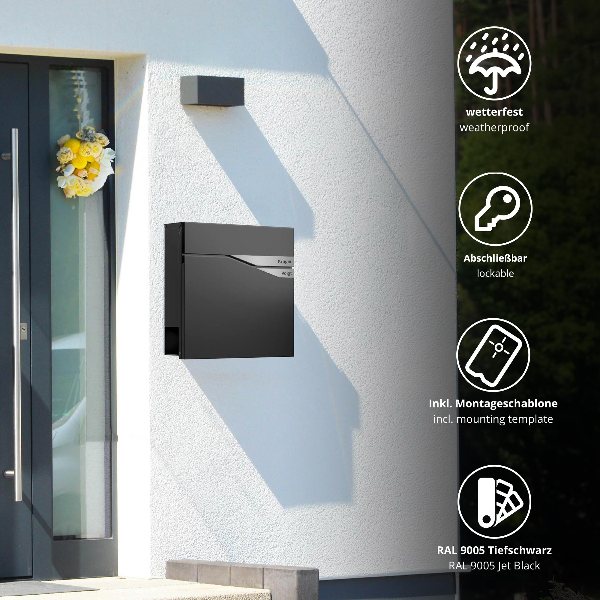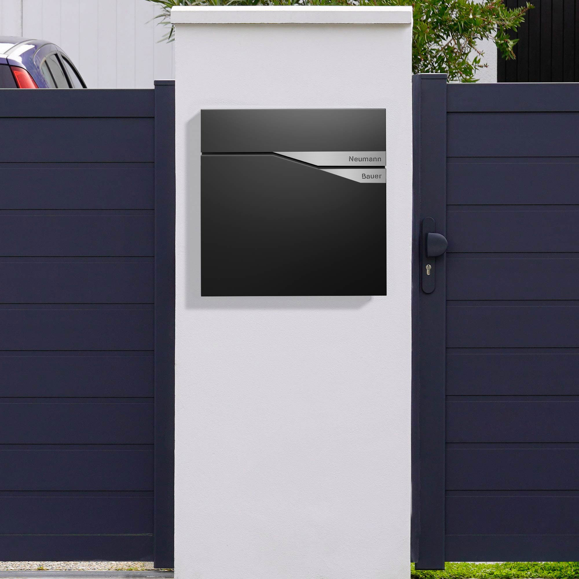 Briefkasten Trelleborg Schwarz (RAL9005) Zinkstahl mit Zeitungsfach - personalisiert mit 2 Namensschildern als Gravur