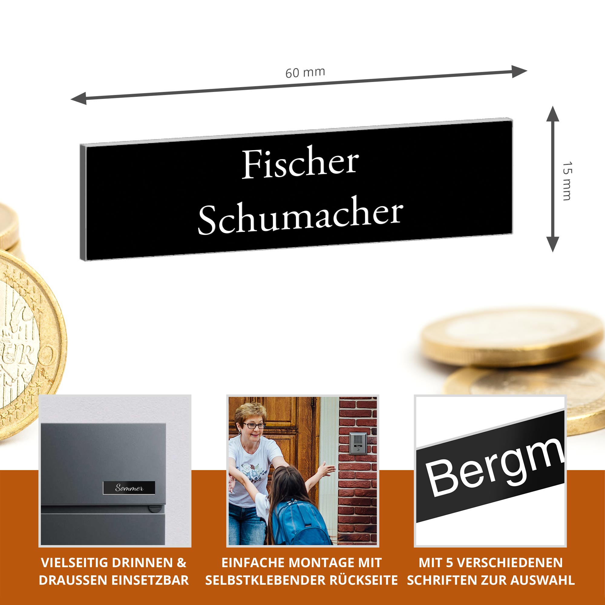 Das Klingelschild Kongsberg in tiefem Schwarz mit weißer Gravur bietet eine edle, moderne Optik – ideal, wenn Ihre Haustür oder Ihr Briefkasten dunkel ist. Mit den Maßen 60 × 15 mm ist das Türschild kompakt und minimalistisch, zugleich jedoch dank der kontrastreichen, individuellen Gravur (ein- oder zweizeilig) gut lesbar. Die selbstklebende Rückseite des Namensschilds garantiert eine unkomplizierte Montage, das hochwertiges Acryl-Material ist wetterfest und für Außenanwendung geeignet. Personalisieren Sie Ihr Briefkastenschild mit Namen, Hausnummer oder Zusatz in fünf Schriftarten, optional mit abgerundeten Ecken oder einem "Keine Werbung"-Schild – hochwertig, langlebig und stilvoll.