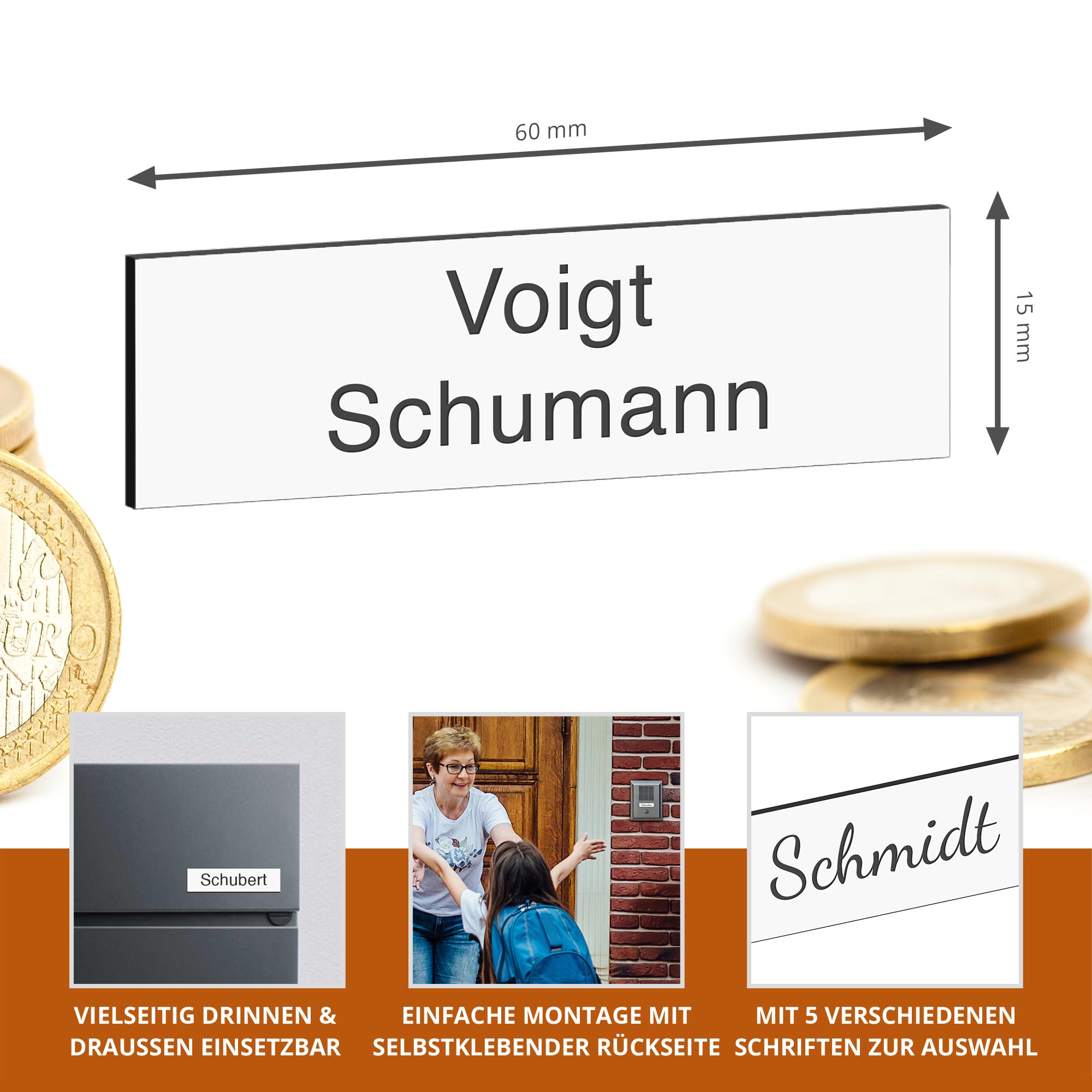 Das Klingelschild Kongsberg in klassischem Weiß ist die perfekte Wahl, wenn Sie eine dezente und moderne Optik bevorzugen. Mit 60 × 15 mm eignet sich das Türschild ideal für Briefkasten oder Haustür. Die individuelle Gravur - in einer oder zwei Zeilen - wird dauerhaft eingearbeitet, und die selbstklebende Rückseite ermöglicht eine schnelle Montage ohne Aufbohren. Durch witterungsbeständiges hochwertiges Acryl (2-Schicht-Material) ist das Namensschild sowohl für Innen als auch Außen geeignet. Gestalten Sie Ihr individuelles Briefkastenschild mit Wunschtext in fünf Schriftarten – schlicht, elegant und individuell. Optional mit abgerundeten Ecken oder einem "Keine Werbung"-Schild.